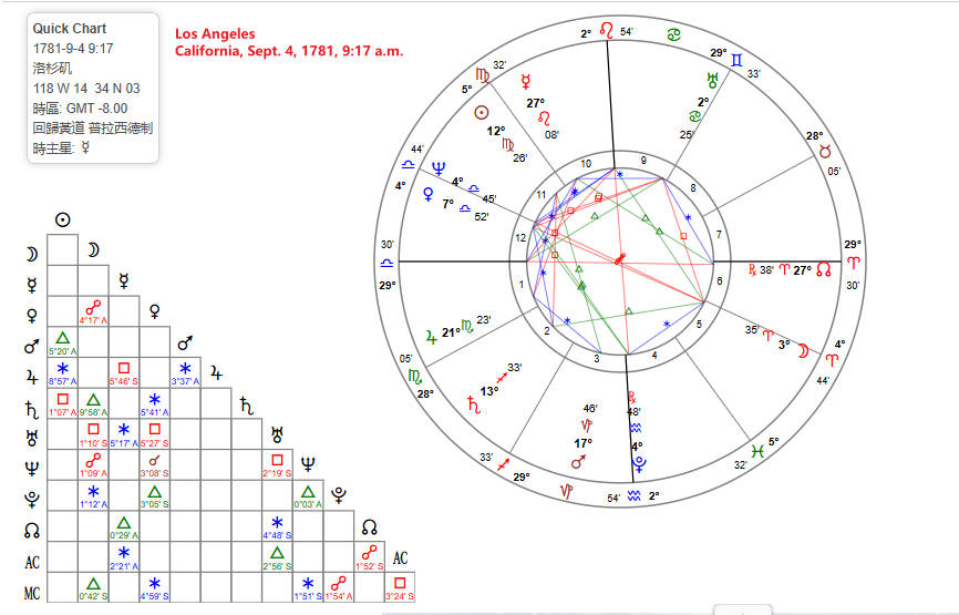 1817 年——洛杉矶第一所学校的记录:木星(第五宫的共同主星,代表学校)与水星逆行呈四分相。