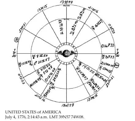 C. E. James 先生进行了广泛的研究,他认为美国星盘的时间应该是下午 5:00。他的星盘在表格中编号为 329。以下示例以 1776 年 7 月 4 日凌晨 2:13 的星盘为例,这是我自 1908 年以来一直使用的星盘,该星盘位于本课开头。