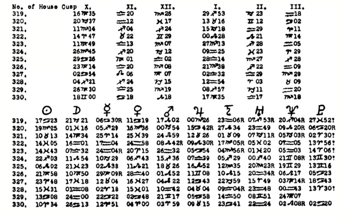 Chart 319 is that of the Argentine Republic. Sept. 6,1930, the president having been forced to resign a few days earlier, the vice-president also resigned, and the Military Assembly took possession of the government: Jupiter, ruler of 1st (people), ad been square Saturn p, ruler of 2nd (money) a number of years, and discontent had arisen over the handling of finances. Mars, ruler of 12th (secret enemies), conjunction Jupiter r, ruler of 1 st (people). Sun, ruler of 7th (open enemies), semi-sextile Uranus r in 12th (secret enemies). Mercury, ruler of 10th (administration), square Venus r in 7th (open enemies).